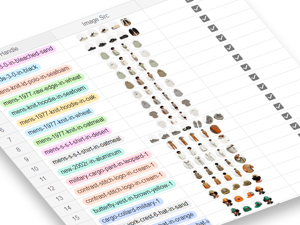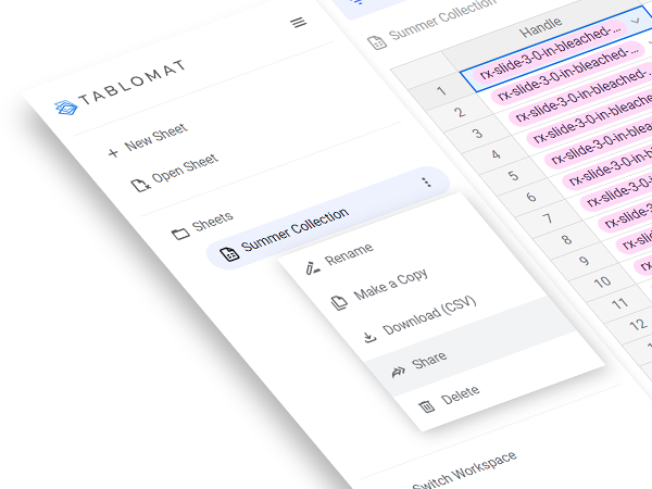 Need to add some images to your spreadsheet? Just drag and drop a directory of images and Tablomat will take care of the rest. Images are uploaded and their URLs are then inserted into the appropriate rows automatically.