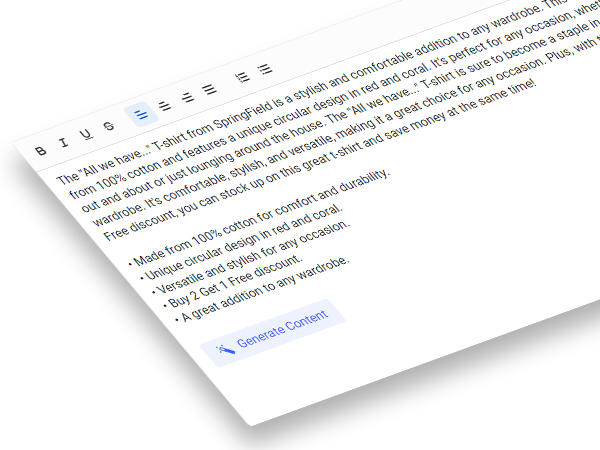 Stop wasting time and money crafting product descriptions! With Tablomat's groundbreaking AI technology, you can instantly generate thousands of ready-to-use rich product descriptions with just one click!